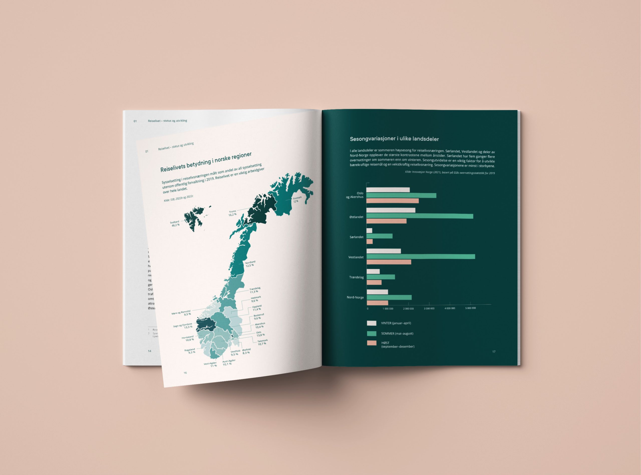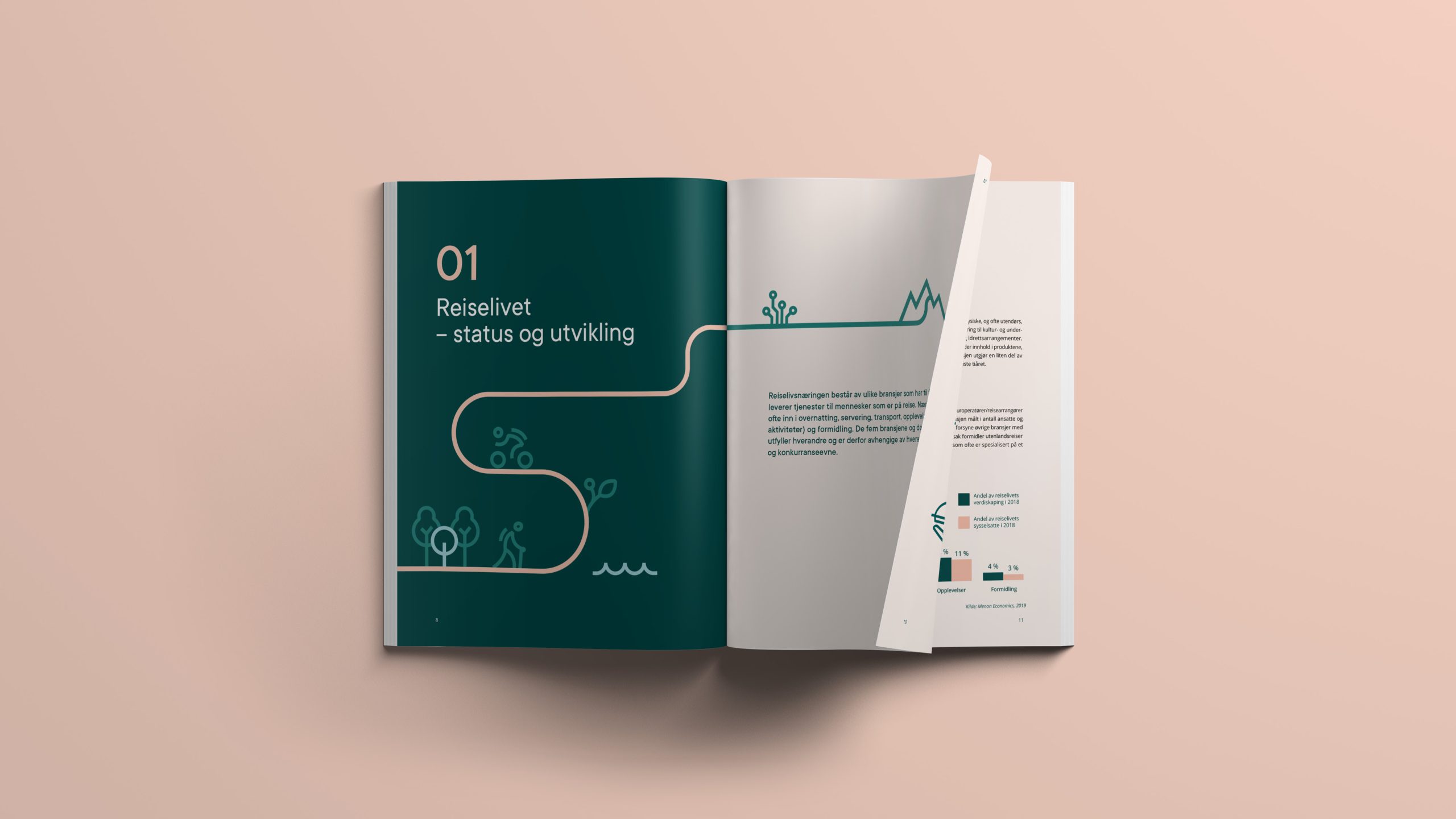 Regjeringen staket ut kursen for en mer lønnsom, grønnere og bærekraftig fremtid for norsk reiseliv. For Nærings- og fiskeridepartementet har vi utviklet den visuelle identiteten til Veikart for reiselivsnæringen, en del av regjeringens satsing på grønt industriløft. Som for de øvrige veikartene i serien har vi utviklet fargepalett, illustrasjoner, ikoner og infografikk spesielt tilpasset tematikken.