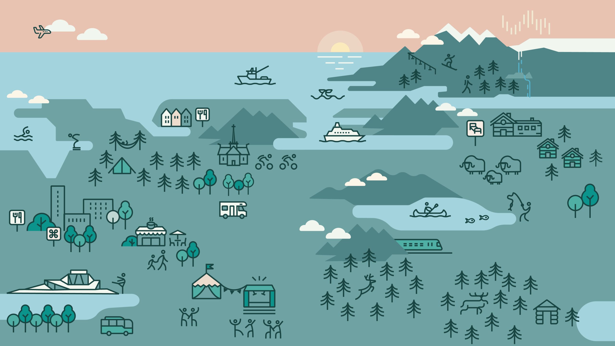 Den overordnede illustrasjonen fungerer som en visuell fortelling om mangfoldet og variasjonen i norsk reiseliv, med vekt på mennesker, landskap og verdiskaping i hele landet.