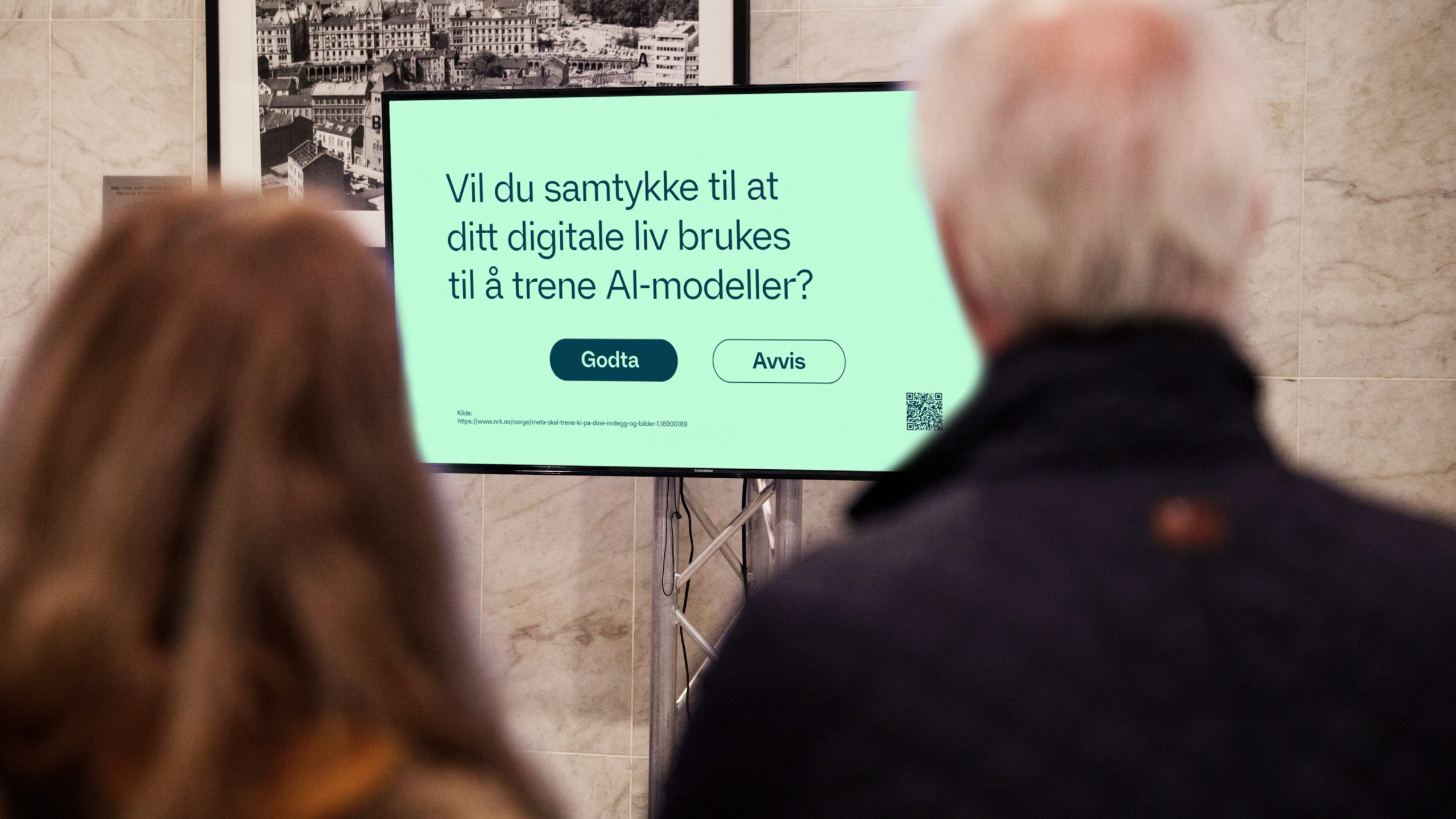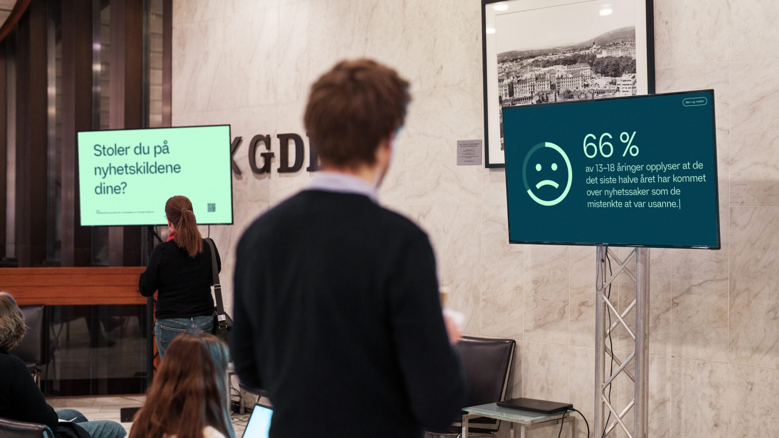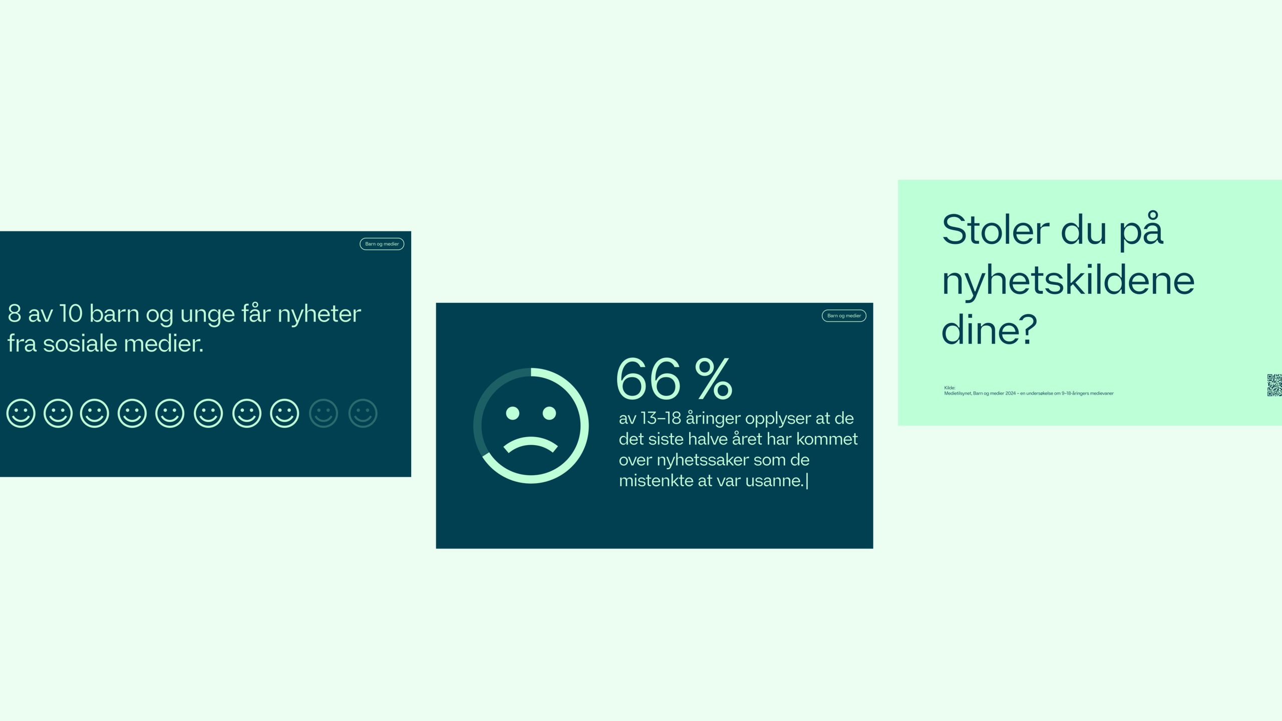 I samarbeid med Sesong 1 utarbeidet vi en digital utstilling bestående av ti skjermer med animasjoner og infografikk om ulike problemstillinger knyttet til temaet. Vi hadde fokus på både positive og negative sider om falske nyheter og desinformasjon i SoMe, personvern, demokratisk deltagelse og digital kompetanse, ytringsfrihet, ekstremisme, polarisering og ekkokamre, deep fake, faktasjekking, AI og algoritmer, reguleringer og lovverk.